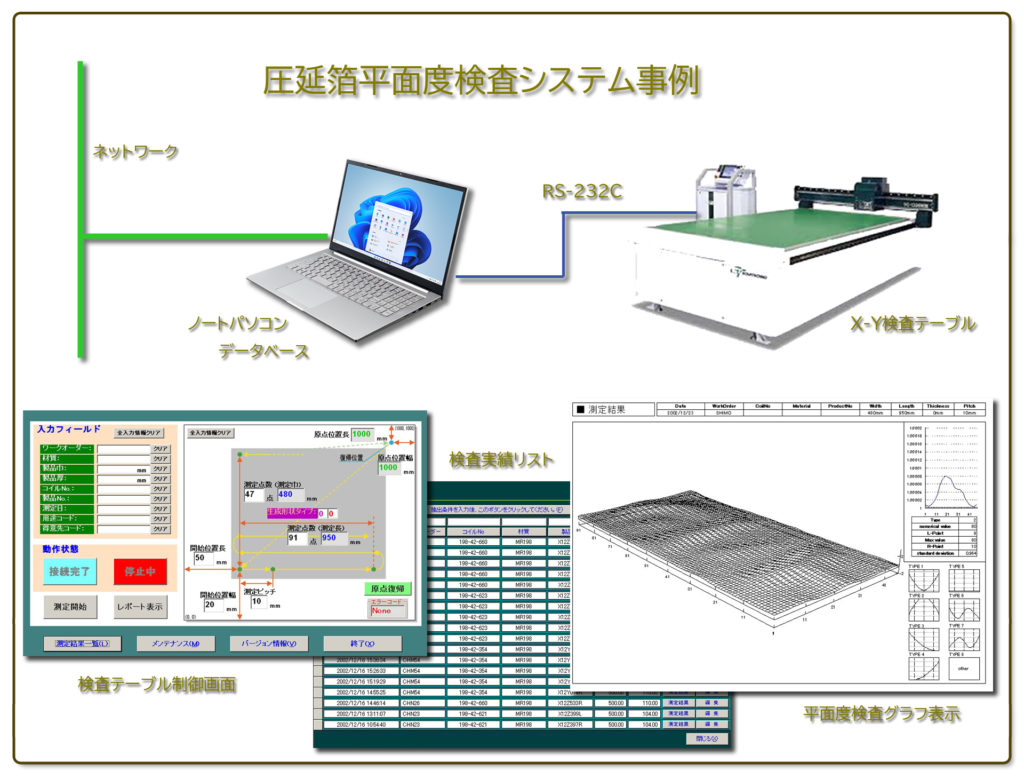 | 本システムは、アルミ圧延工程で製造される箔・板材の平面度を高精度に測定するオフライン検査システムです。 渦電流センサーを搭載したX-Y検査テーブルが素材全体を自動スキャンし、わずかな歪・凹凸を高解像度で検出。 PC側では検査条件を設定し、計測結果を三次元グラフとして即時に表示・レポート出力します。 また、全データはデータベースに自動保存され、過去データとの比較・傾向分析・品質履歴のトレースが容易。 これにより、圧延工程の品質ばらつき低減・設備状態の予知保全・製品信頼性の可視化を実現します。 さらに、検査データを製造部門・品質保証部門が共有することで、開発・生産・品質の三位一体連携を強化。 「見えなかった歪を“数値化”する」――品質管理の新たなスタンダードを創ります。 |